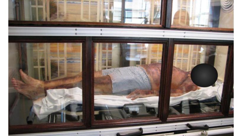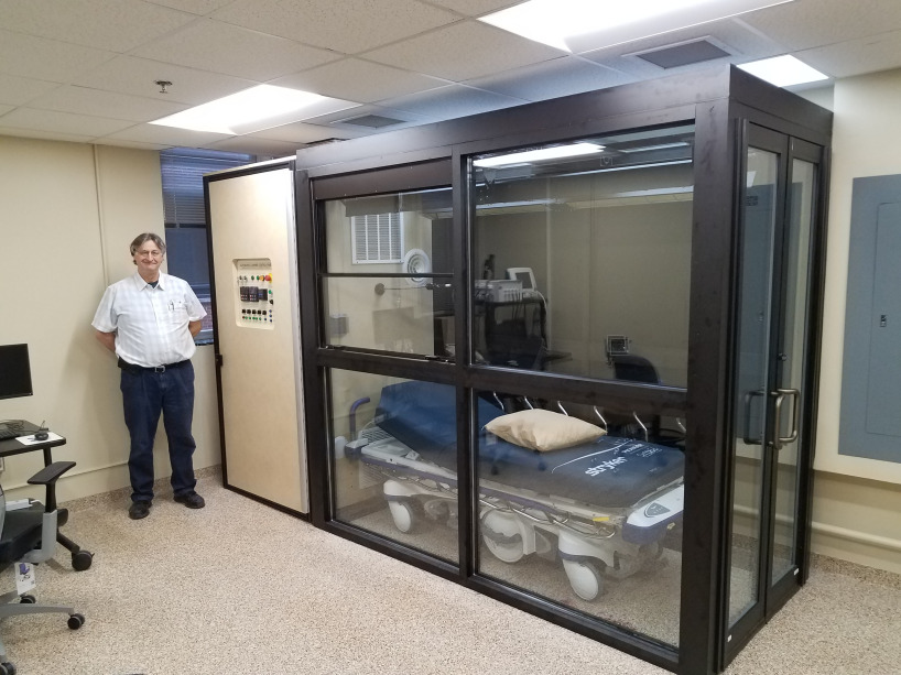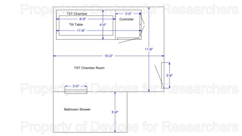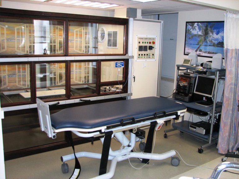 There are two options for placing the patient into the chamber: side entrance of a patient on a gurney and a vertical sliding door entrance with a patented detachable patient tilt table for orthostasis maneuvers.